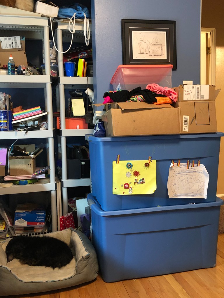 Here’s a picture of one wall of my office. The two bins you see here are full of yarn projects. They haven’t been opened in almost 6 years. They’ve been unmoved for so long, my 5-year-old daughter has decorated them. More yarn projects are lingering on top and a variety of art projects (along with old, un-archived hard drives) on the shelves in the closet. But there’s my little dachshund, Peanut, in her bed so everything is going to be all right.